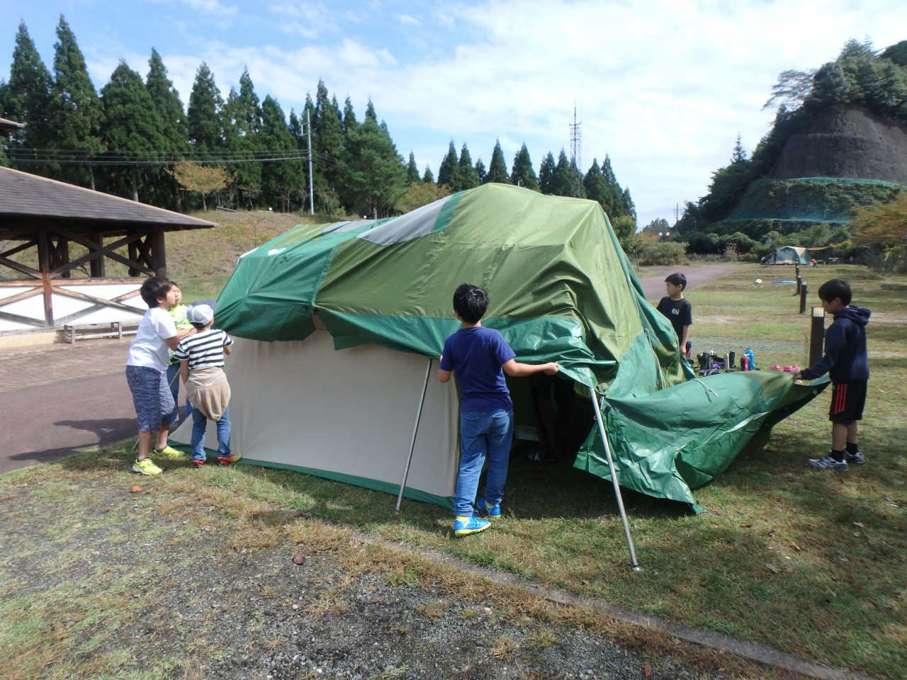 いっぱい遊んで いよいよテント張りです