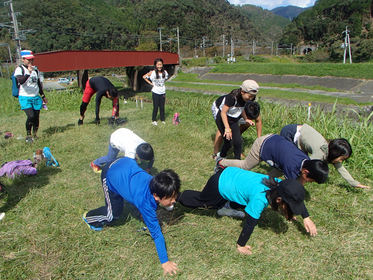 グループで手をつなぎ息を合わして